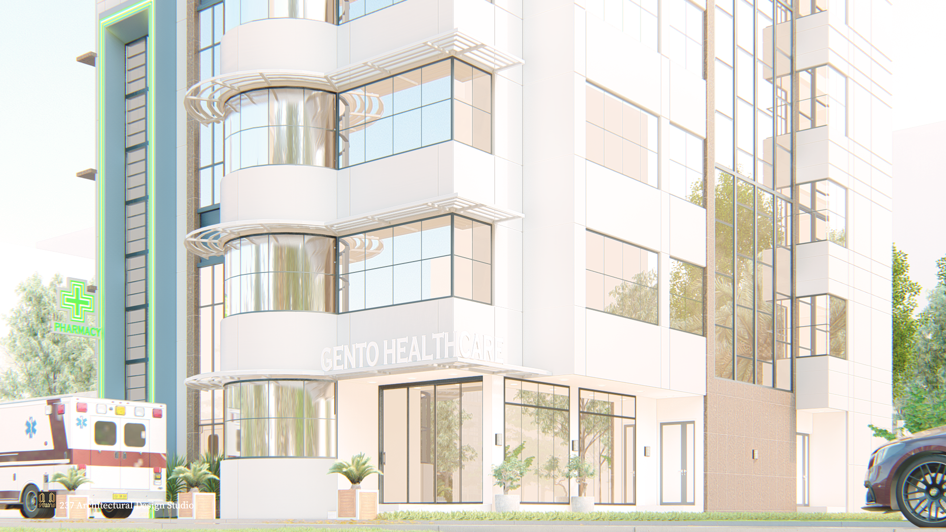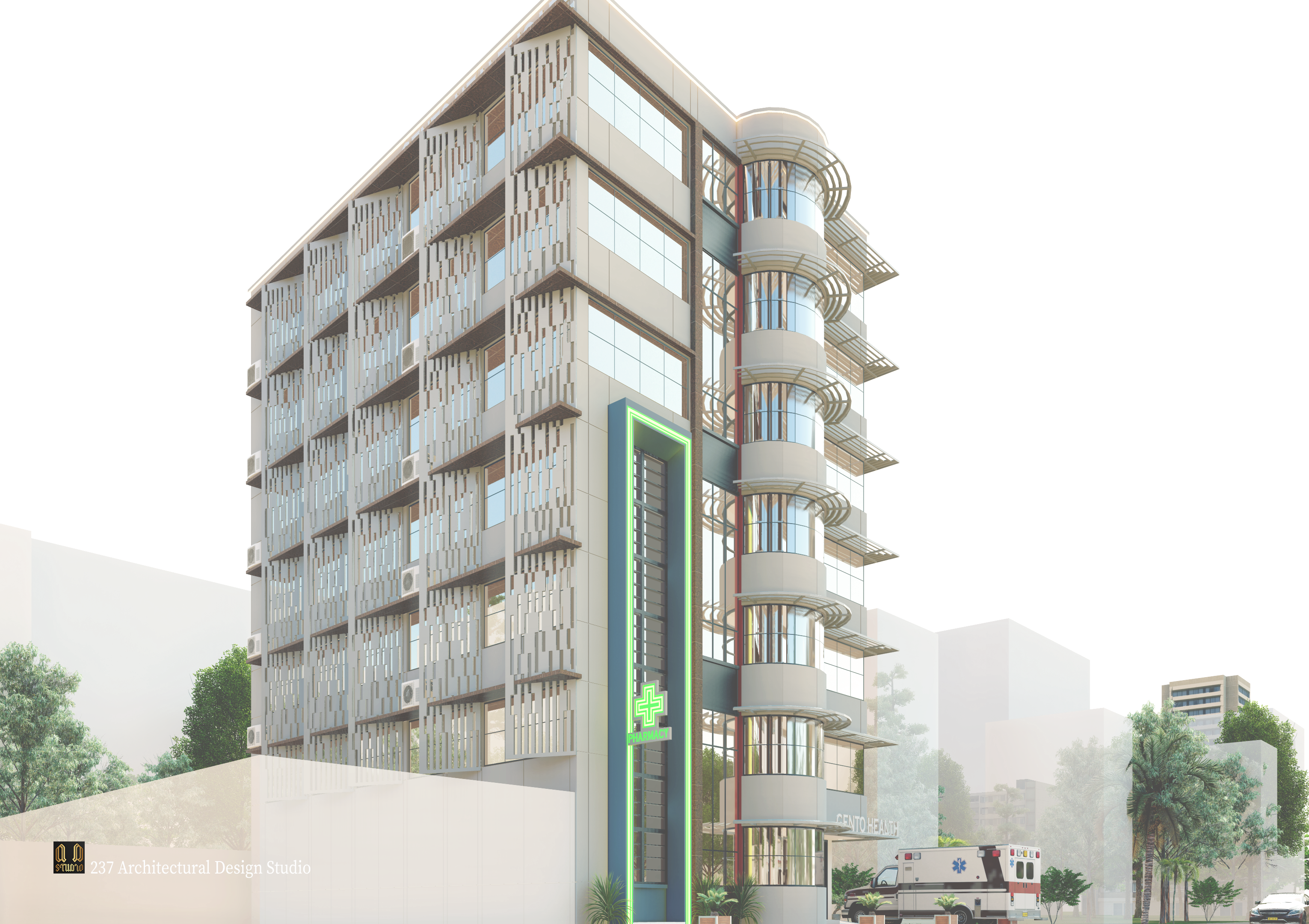 The design moves beyond the conventional “box hospital” typology. Instead, it introduces a refined, contemporary medical tower that projects trust, precision, and accessibility. The building establishes a strong urban identity through its sculpted cylindrical glazed spine, vertical pharmacy beacon, and layered façade articulation.