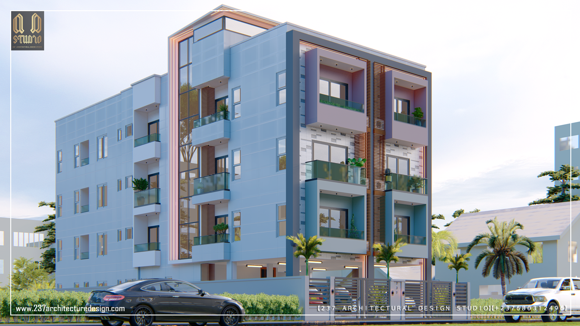 At the heart of the economic city of Douala in Cameroon, this urban icon stands out as a refined living space for urban dwellers. Covering about 372Sq. meter area, appealing angles reveals the architectural finesse of this modern residential block by 237 Architectural Design Studio. A harmonious blend of vertical wooden screens, textured faรงades, and vibrant accent boxes defines the buildingโs character. Each balcony is not only a visual rhythm but also a functional outdoor retreat, offering residents a stylish connection to nature. The soft LED edge lighting enhances the clean lines and adds a touch of sophistication that transitions beautifully from day to night.